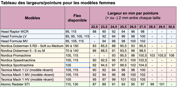 Les marques sur leurs sites ont pour habitude de donner la largeur en fonction d’une pointure donnée. Par exemple : sur le site Nordica vous trouverez pour le modèle “Promachine 130” une largeur de 98 mm pour une pointure en 26,5. Si vous faites 26,5 alors c’est facile, vous avez votre information. Si non...
